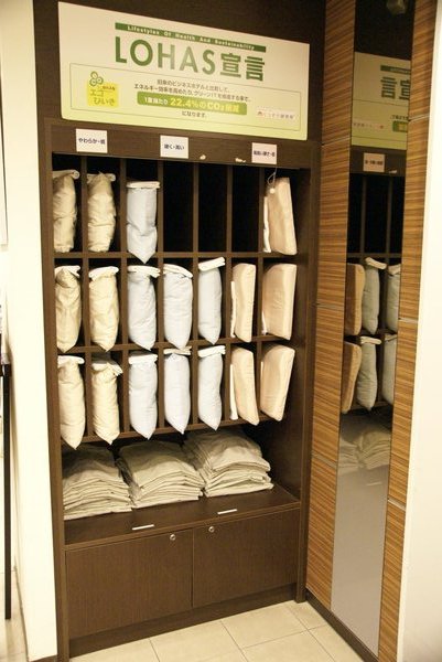 櫃臺對面的櫃子內有許多枕頭可以挑選
